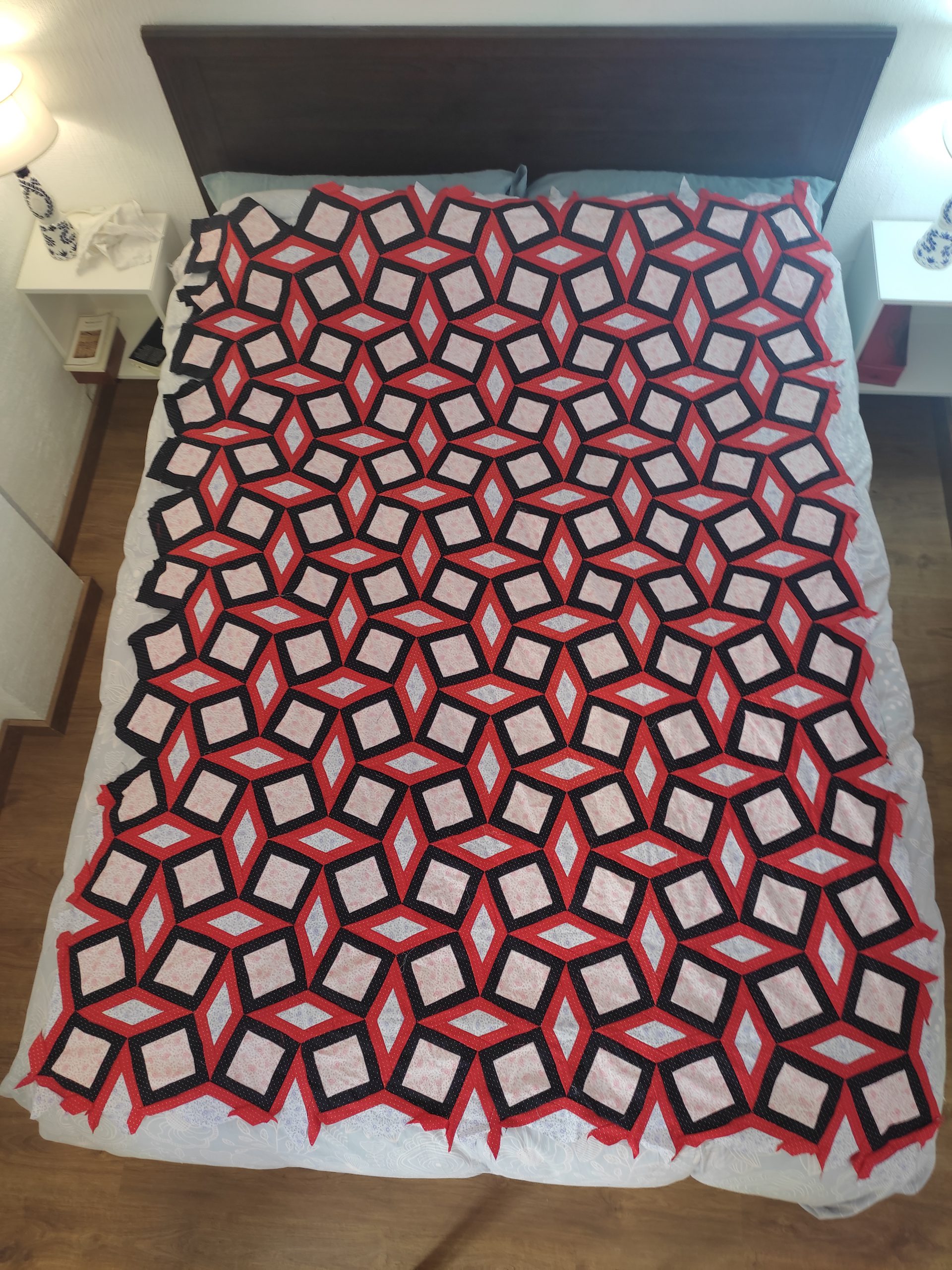 La historia completa me es imposible de trazar ya que empezó con un diseño de estrella central y telas de muchos colores. Muchas de esas telas después se han usado con la de Luisfe, con la de Frank… Y el diseño también ha sufrido mutaciones.